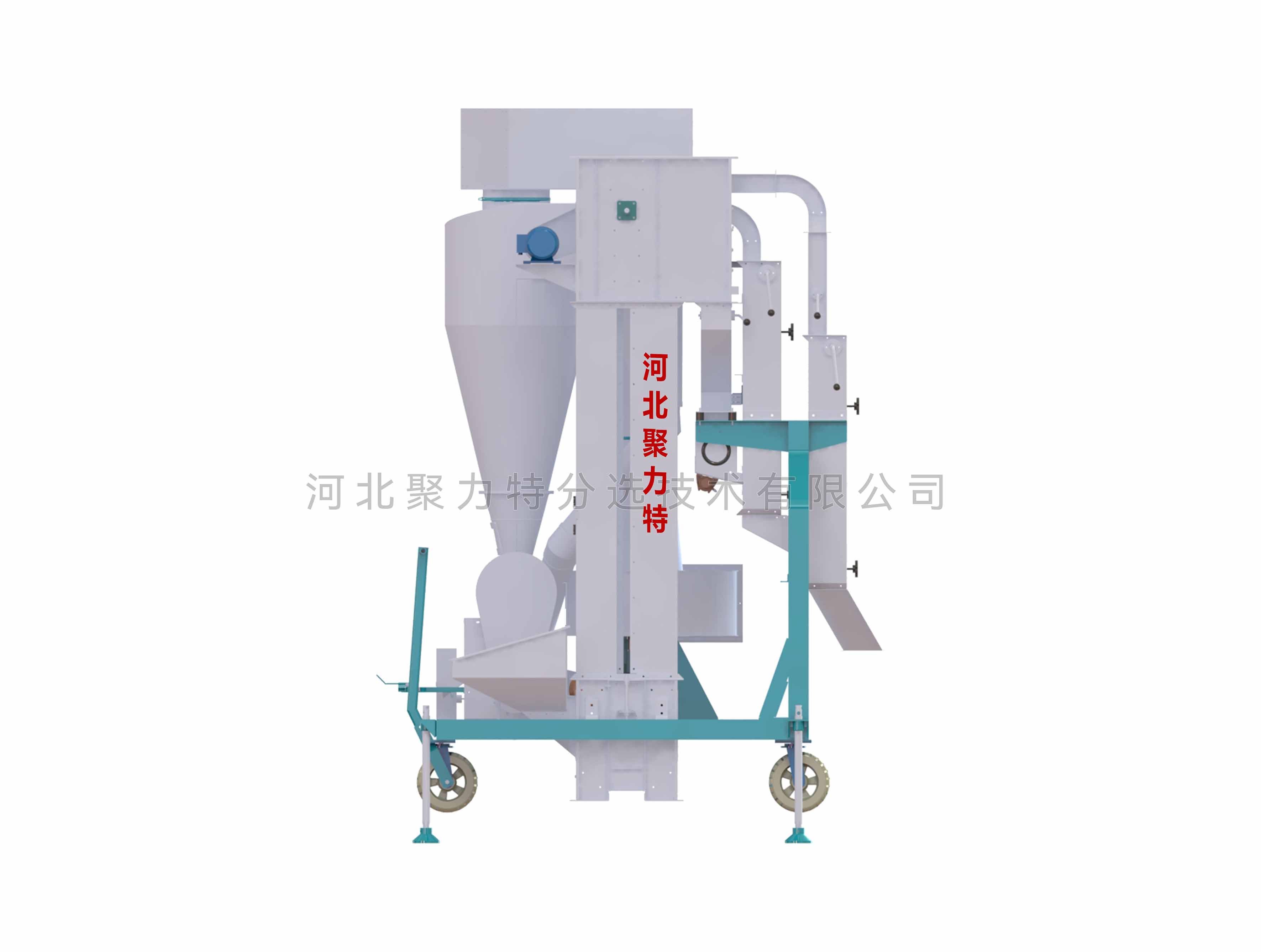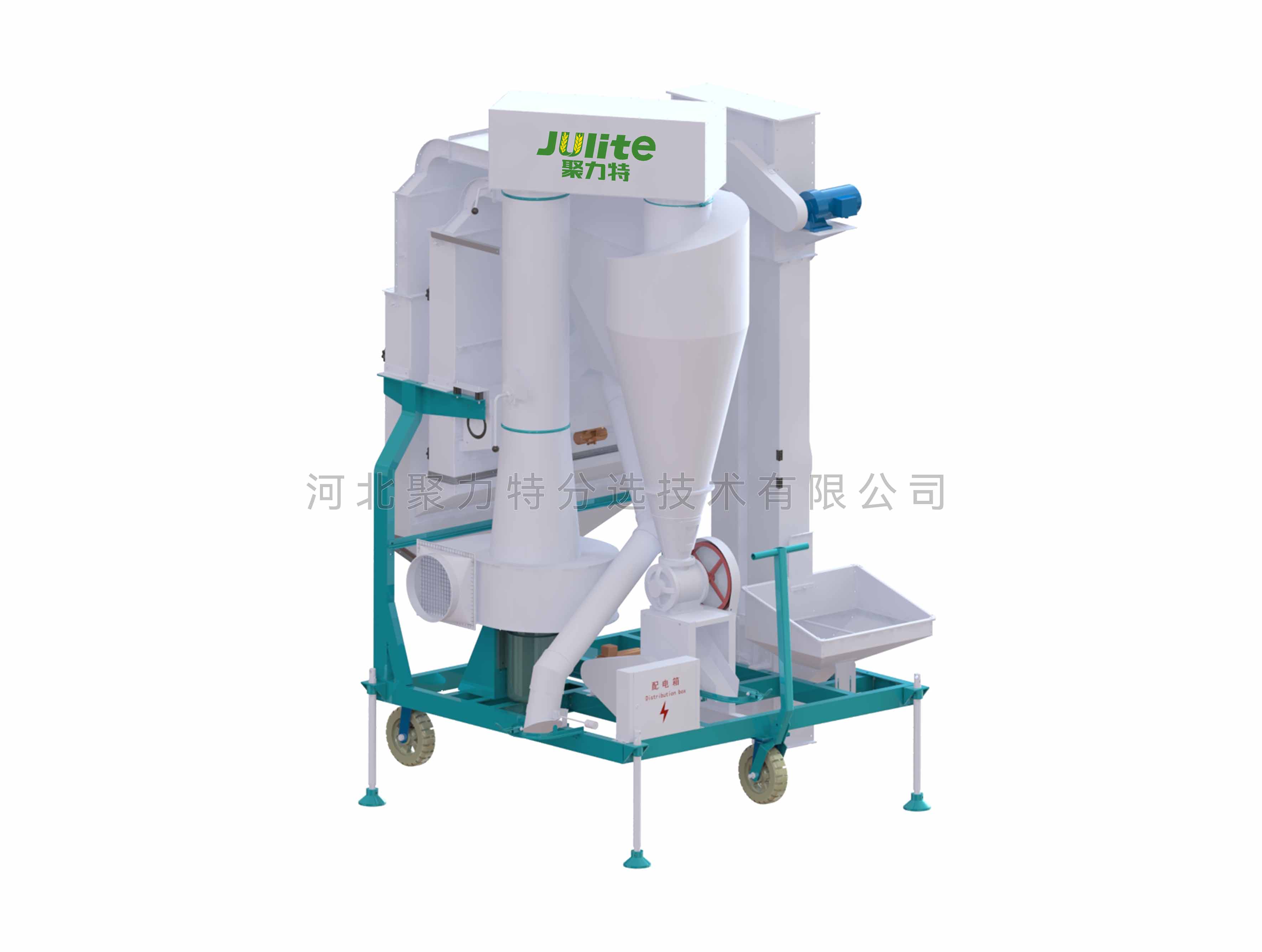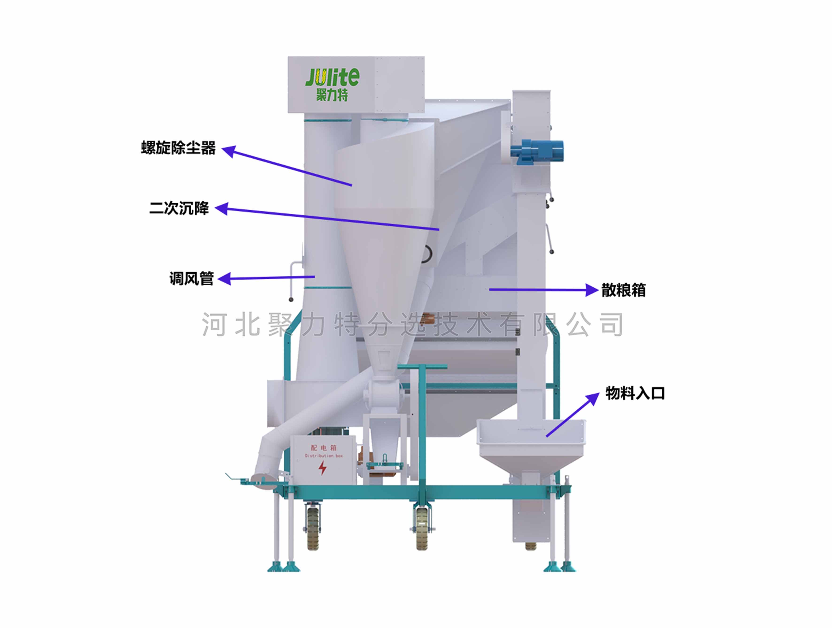物料通過(guò)提升機(jī)進(jìn)入散糧箱,散糧均勻后進(jìn)入第一道立式空氣篩,經(jīng)過(guò)第一道風(fēng)選后,主料進(jìn)入第二道風(fēng)篩進(jìn)行二次風(fēng)選,在風(fēng)力的作用下分離出輕雜質(zhì),經(jīng)旋風(fēng)除塵器過(guò)濾后,由閉風(fēng)器排出。成品通過(guò)出料口排出,進(jìn)入下道工序。