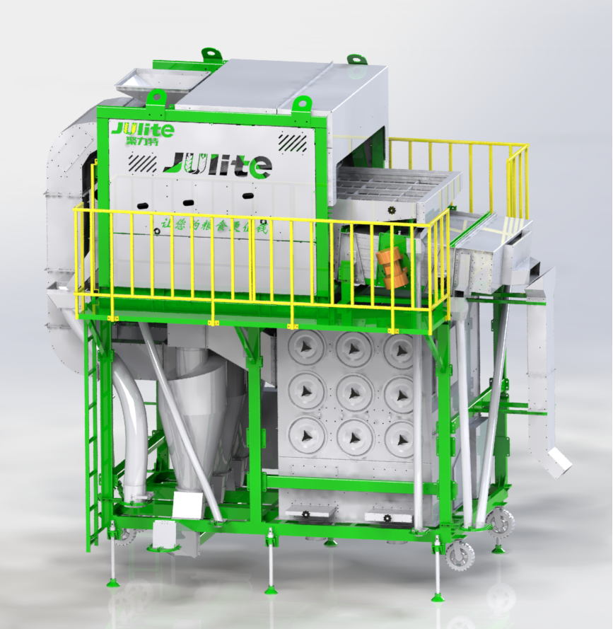 5XCSH-50環(huán)保初清篩主要由上下兩部分結(jié)構(gòu)組成,其中上部分功能為臥式比重風(fēng)選、分級(jí),下部分功能為二級(jí)除塵;物料首先經(jīng)喂入斗進(jìn)入臥式風(fēng)選比重臺(tái),通過臥式比重風(fēng)選分離去除物料中的粉塵、糠殼、碎秸稈、玉米軸芯等輕雜,其中含塵氣體經(jīng)旋風(fēng)除塵器完成一級(jí)除塵,去除粉塵、糠殼等輕雜,經(jīng)過一級(jí)除塵的細(xì)小粉塵空氣進(jìn)入脈沖除塵器完成二級(jí)除塵,去除更細(xì)小的粉塵,達(dá)到合規(guī)潔凈排放。臥式比重風(fēng)選分離后的物料進(jìn)入一層大雜篩去除大雜,然后并行進(jìn)入四層小雜篩去除小雜,排出成品。