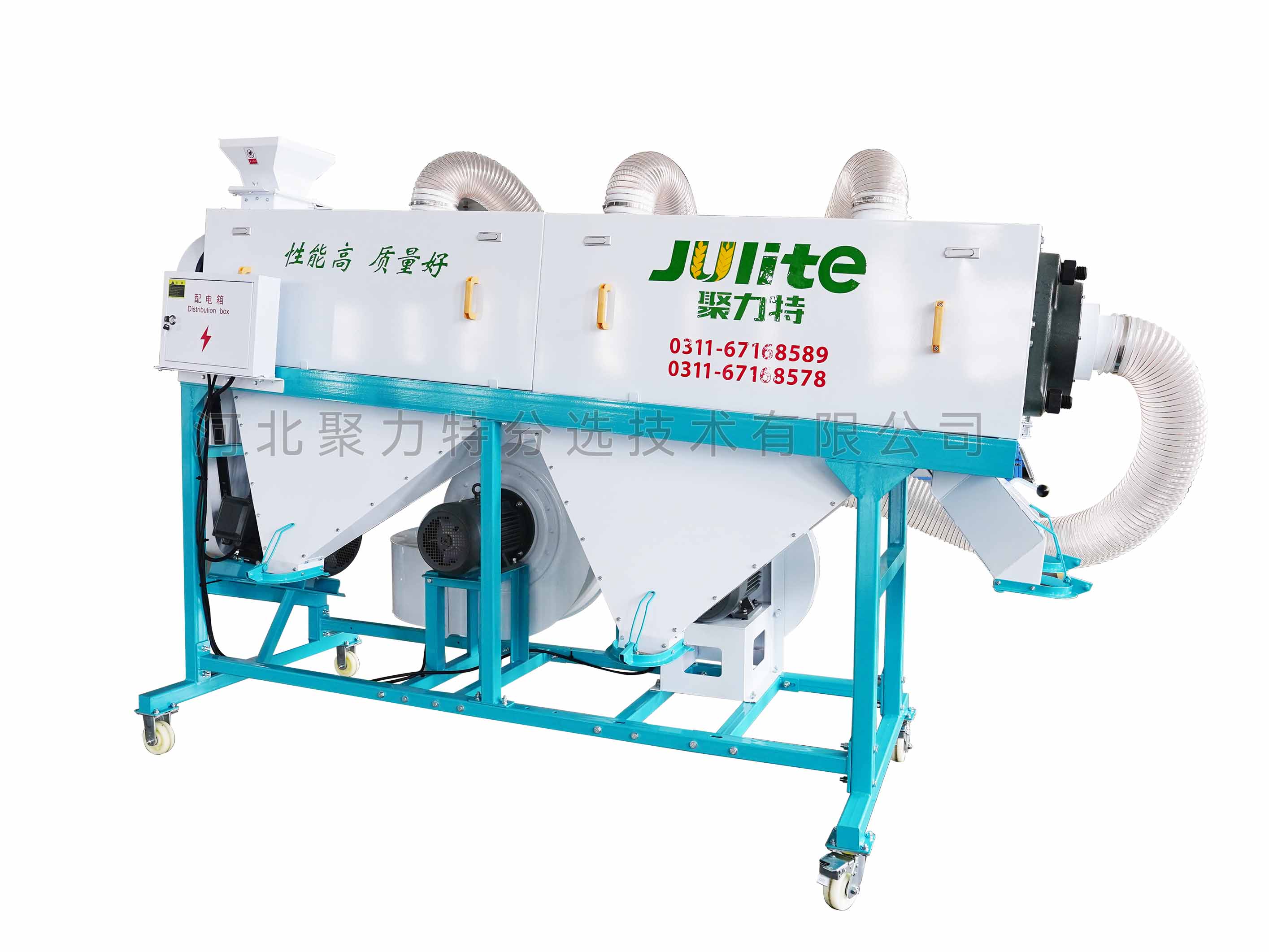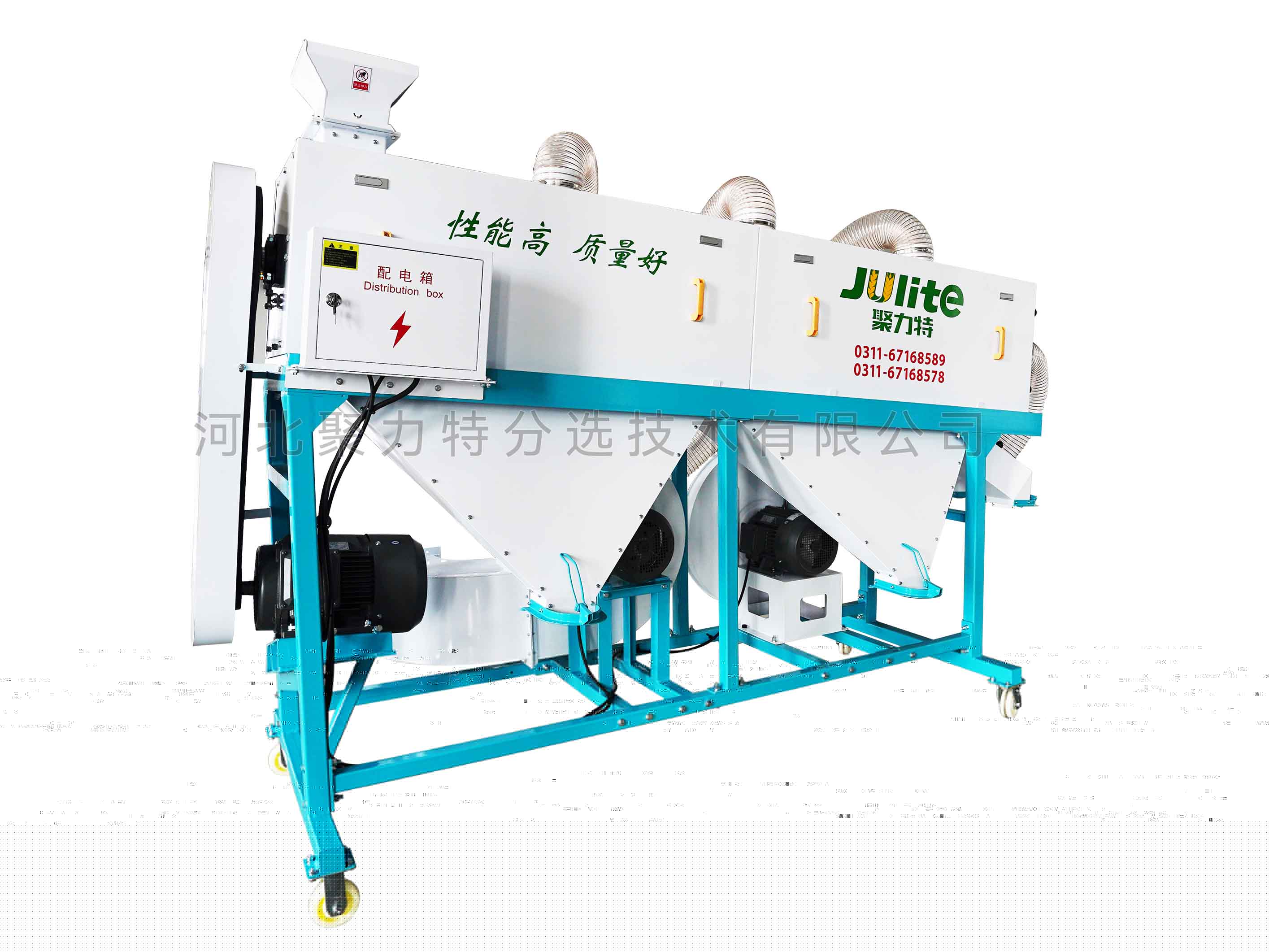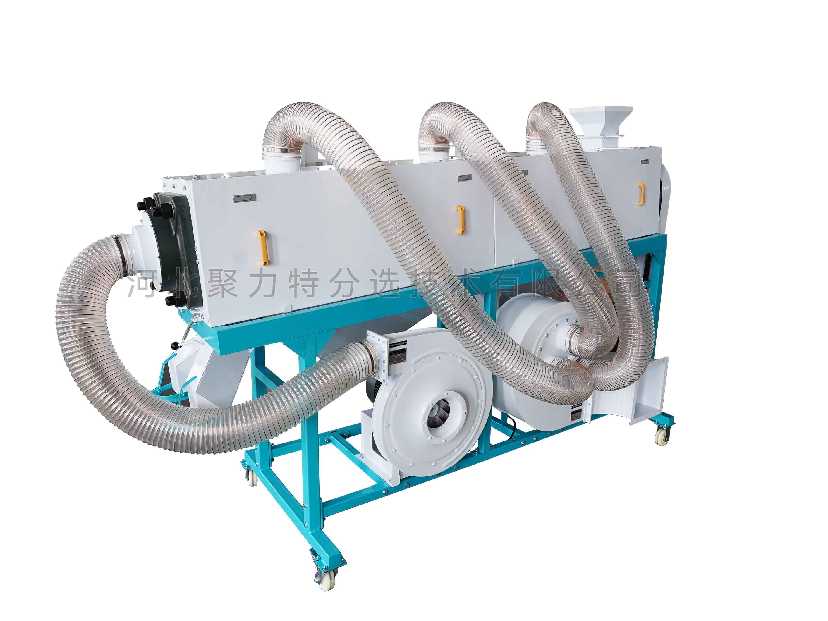 利用螺旋傳動(dòng)運(yùn)送糧食的原理,使物料在流態(tài)化過程中互相置換位置,并與固定在拋光軸上的拋光布互相摩擦,從而有效去除物料表面的粉塵、豆皮、泥垢等附著物,將表皮拋光、擦亮,同時(shí)采用高壓吹氣一中壓抽氣的除塵方式,及時(shí)抽走拋下的粉塵,較重的輕雜(豆皮、泥垢等)掉入集塵箱集中排出,達(dá)到拋光增亮的效果,最終排出成品。